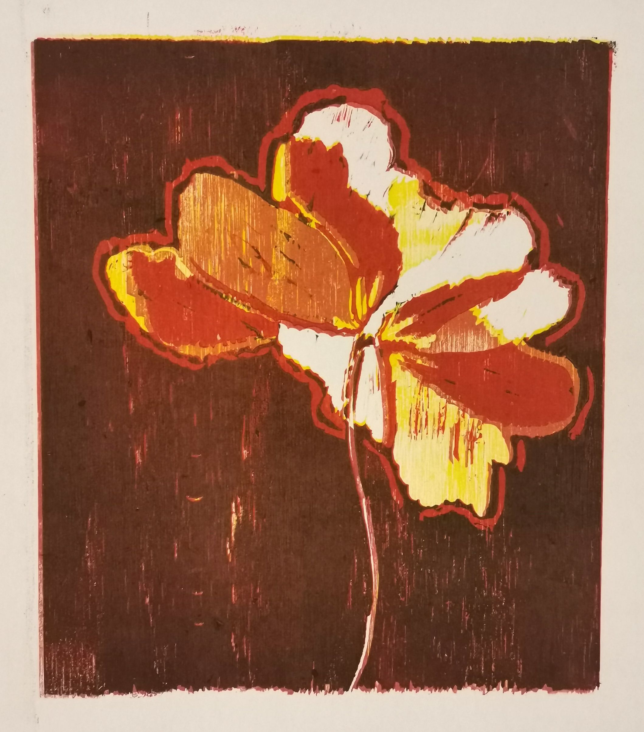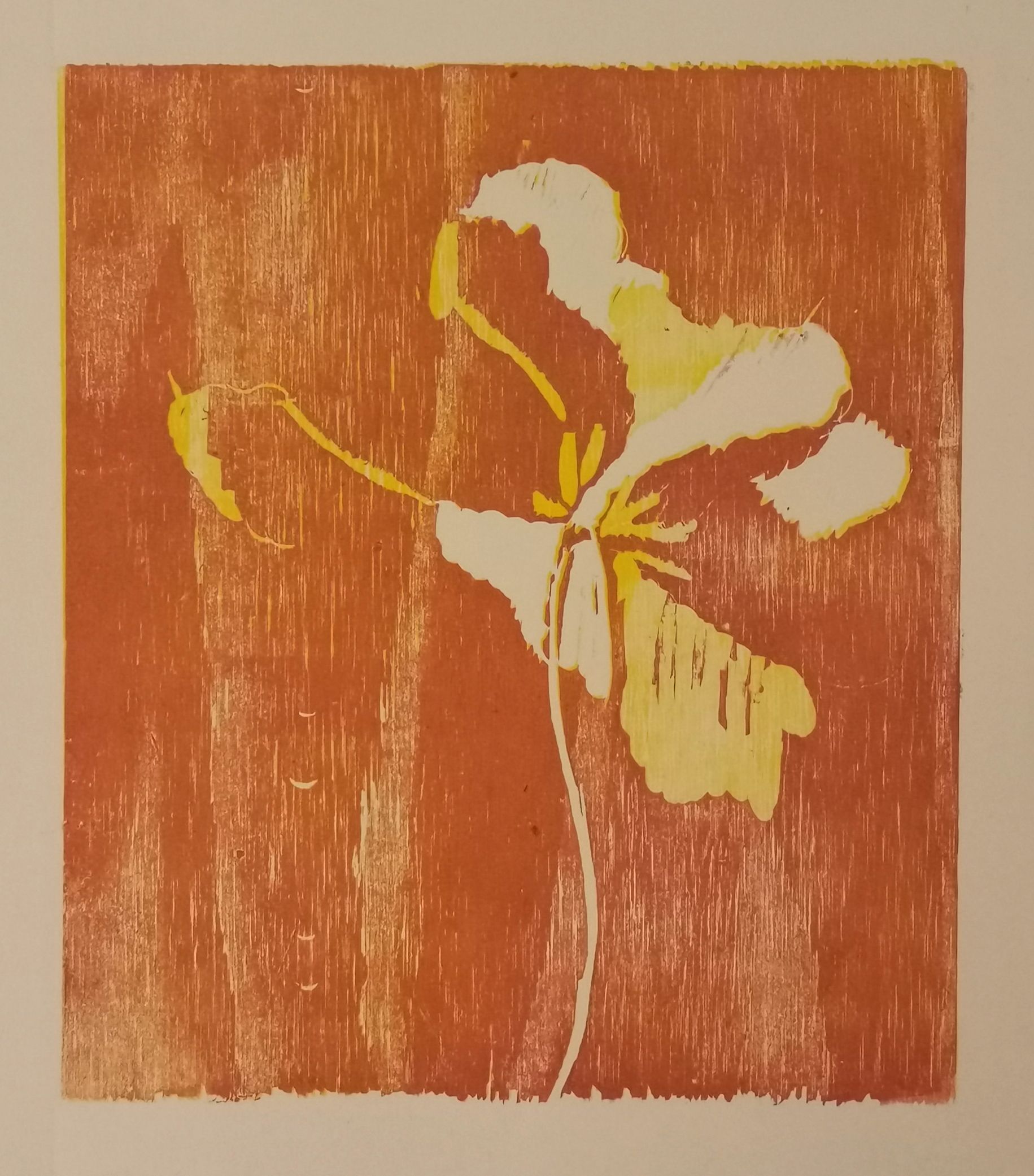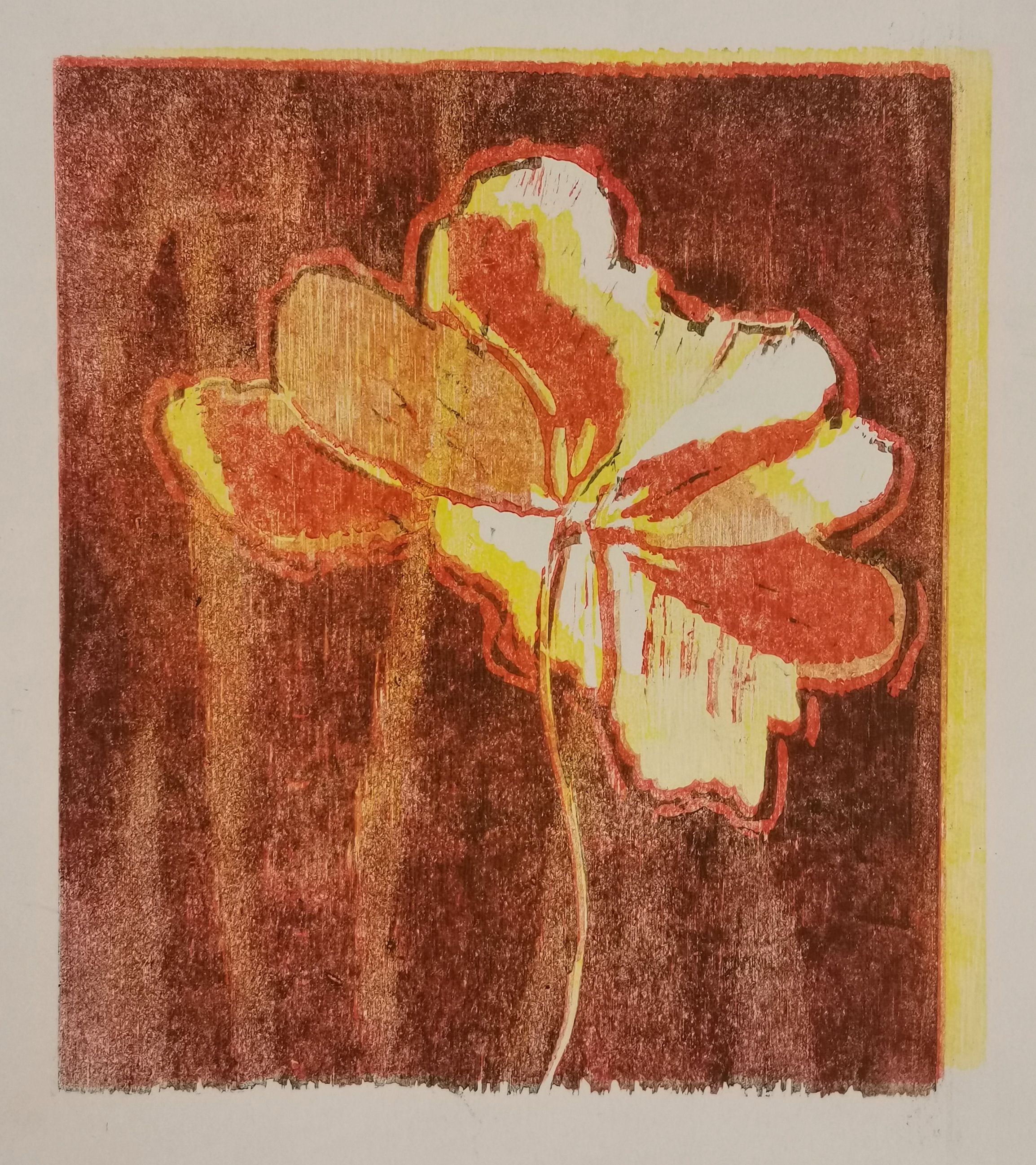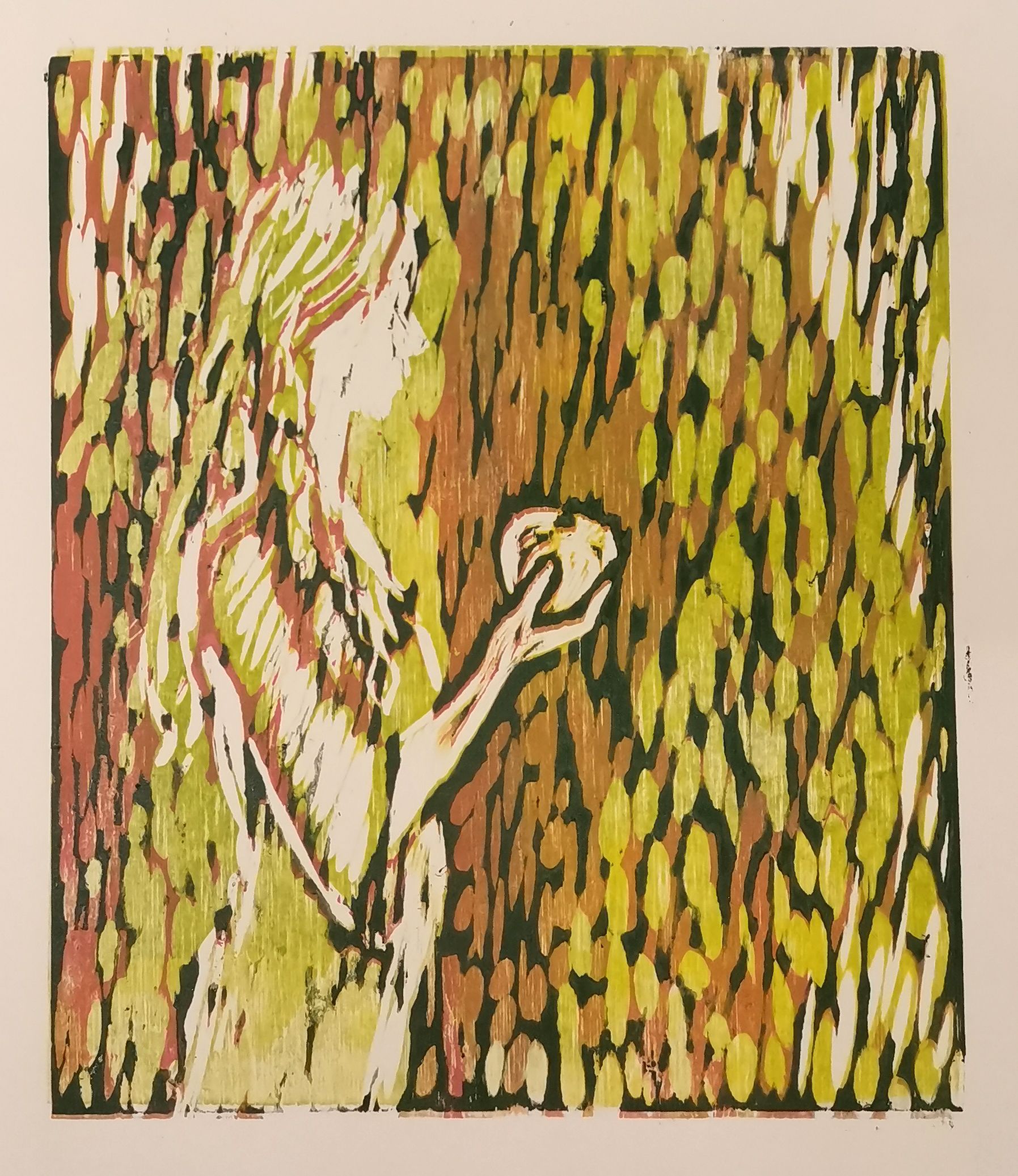 Bildene over viser eksempler på reduksjonstrykk. Det er viktig å trykke på alle de tidligere trykkene, fordi du kan ikke gå tilbake når du jobber videre på platen. Til slutt ender du opp med kun kontur eller små felt som egner seg til en mørk farge.