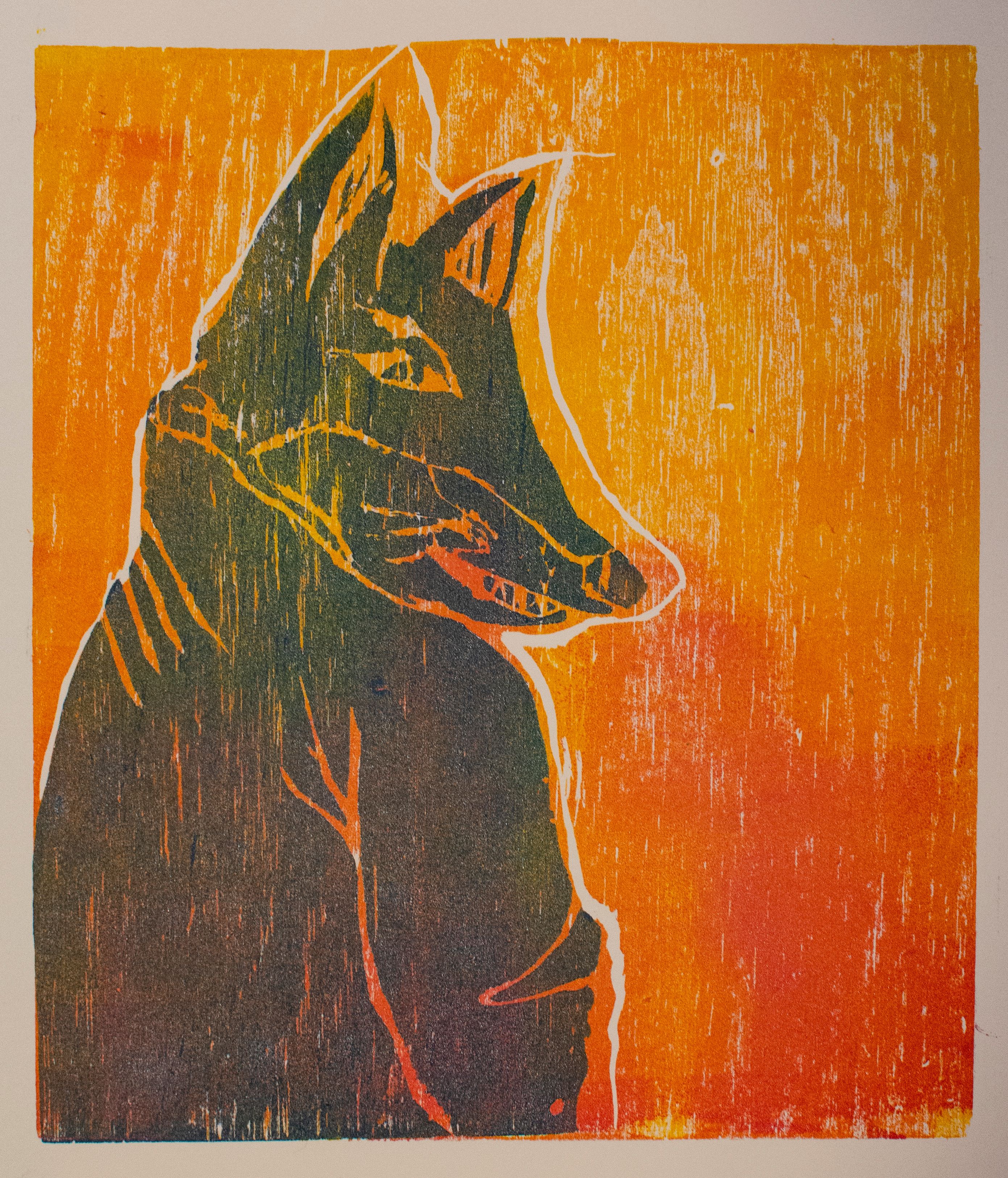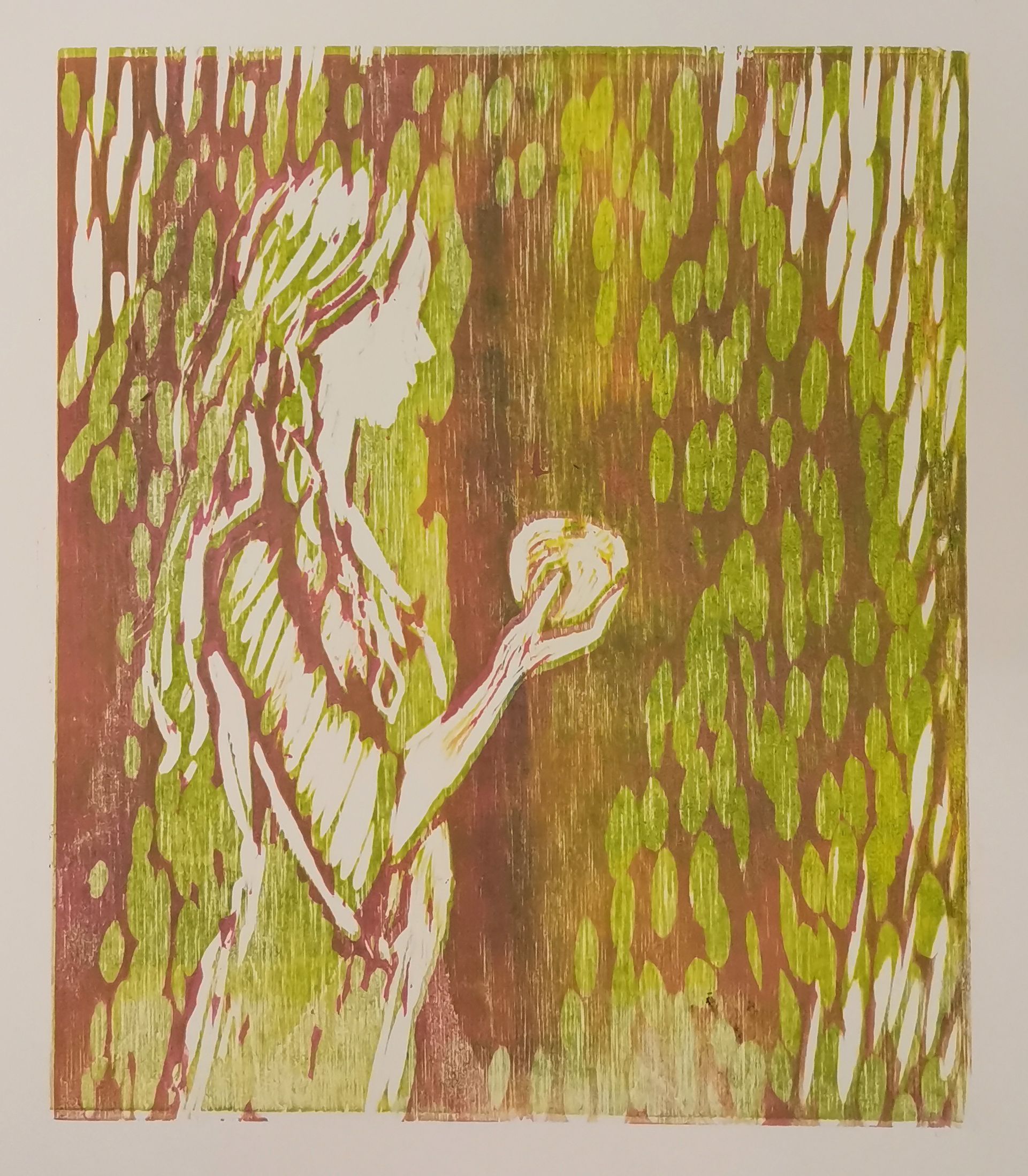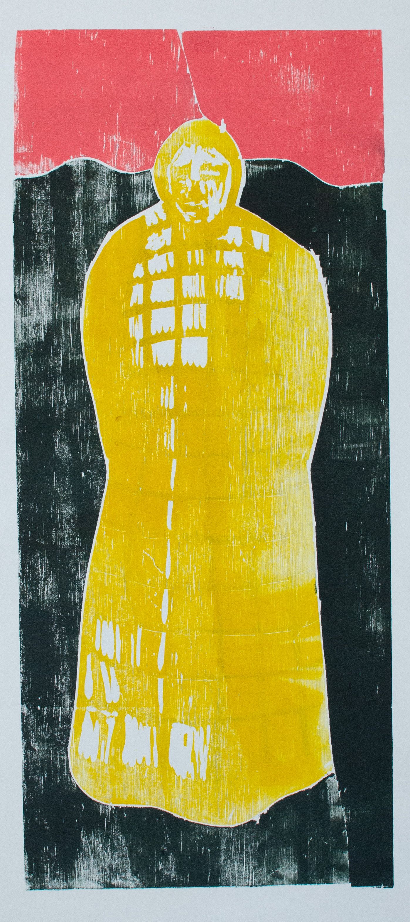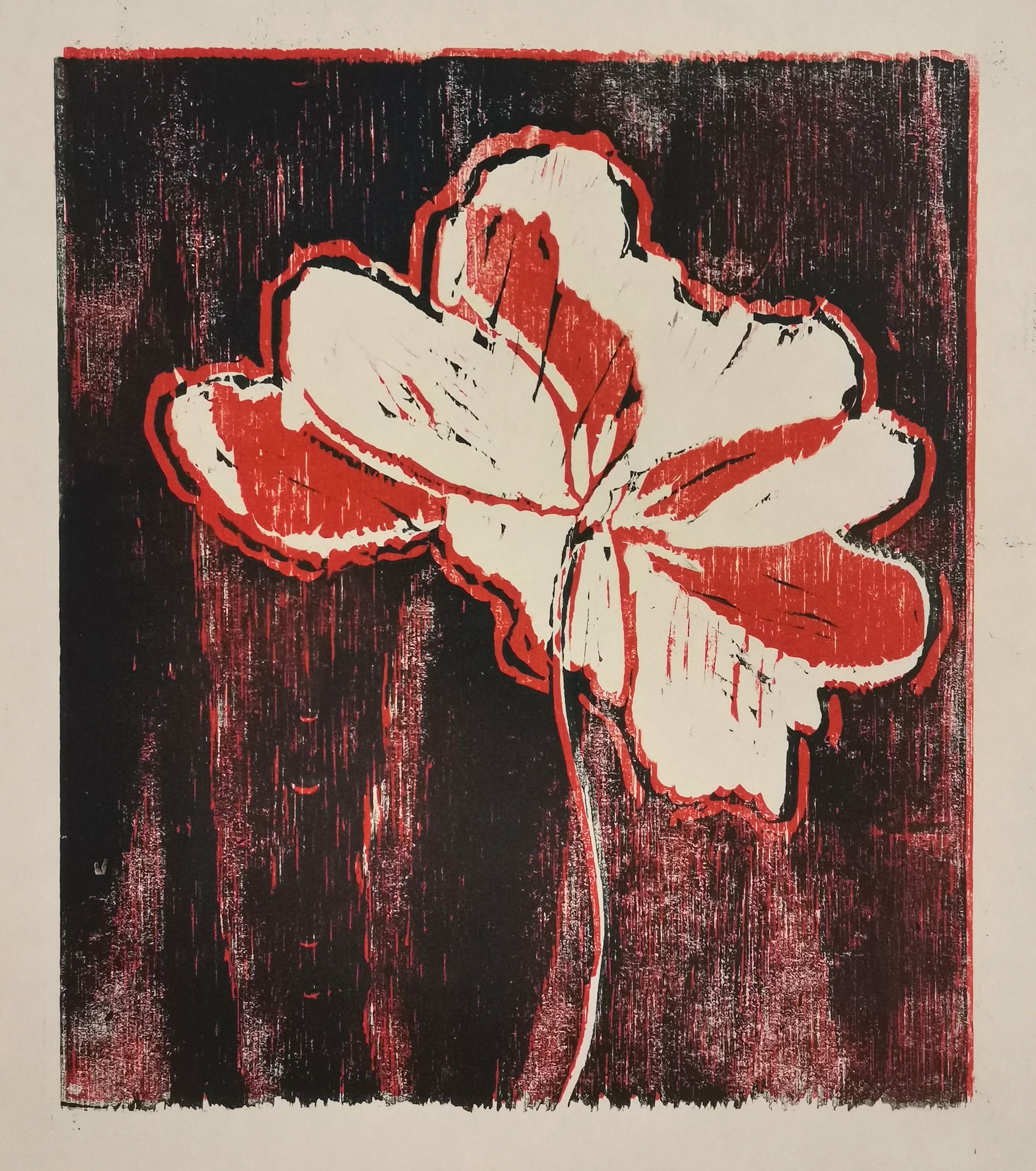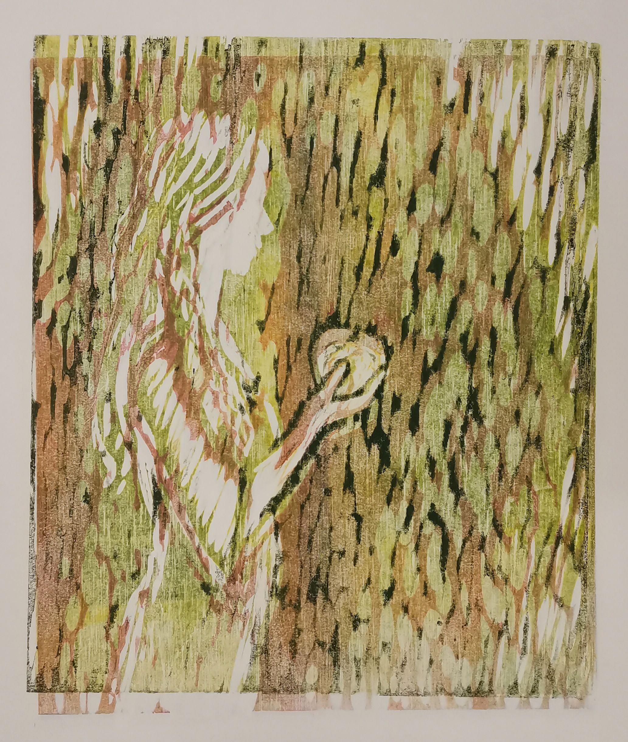 Bildene over viser eksempler på reduksjonstrykk. Det er viktig å trykke på alle de tidligere trykkene, fordi du kan ikke gå tilbake når du jobber videre på platen. Til slutt ender du opp med kun kontur eller små felt som egner seg til en mørk farge.