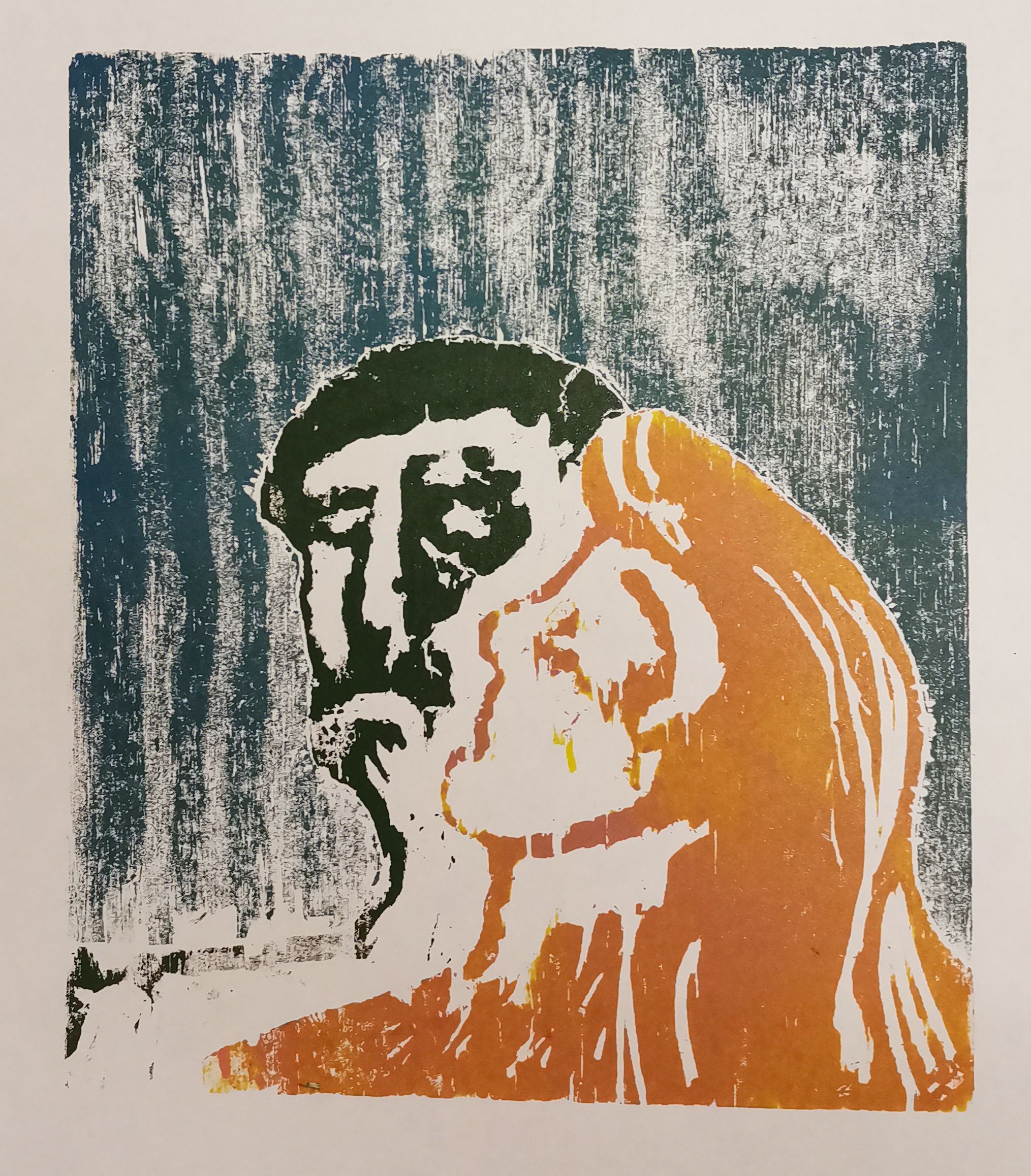 Blindtrykk: Det trykkes uten at det påføres mer trykksverte på platen. Trykket til høyre er et blindtrykk. Arbeidene er utført av en kursdeltager.