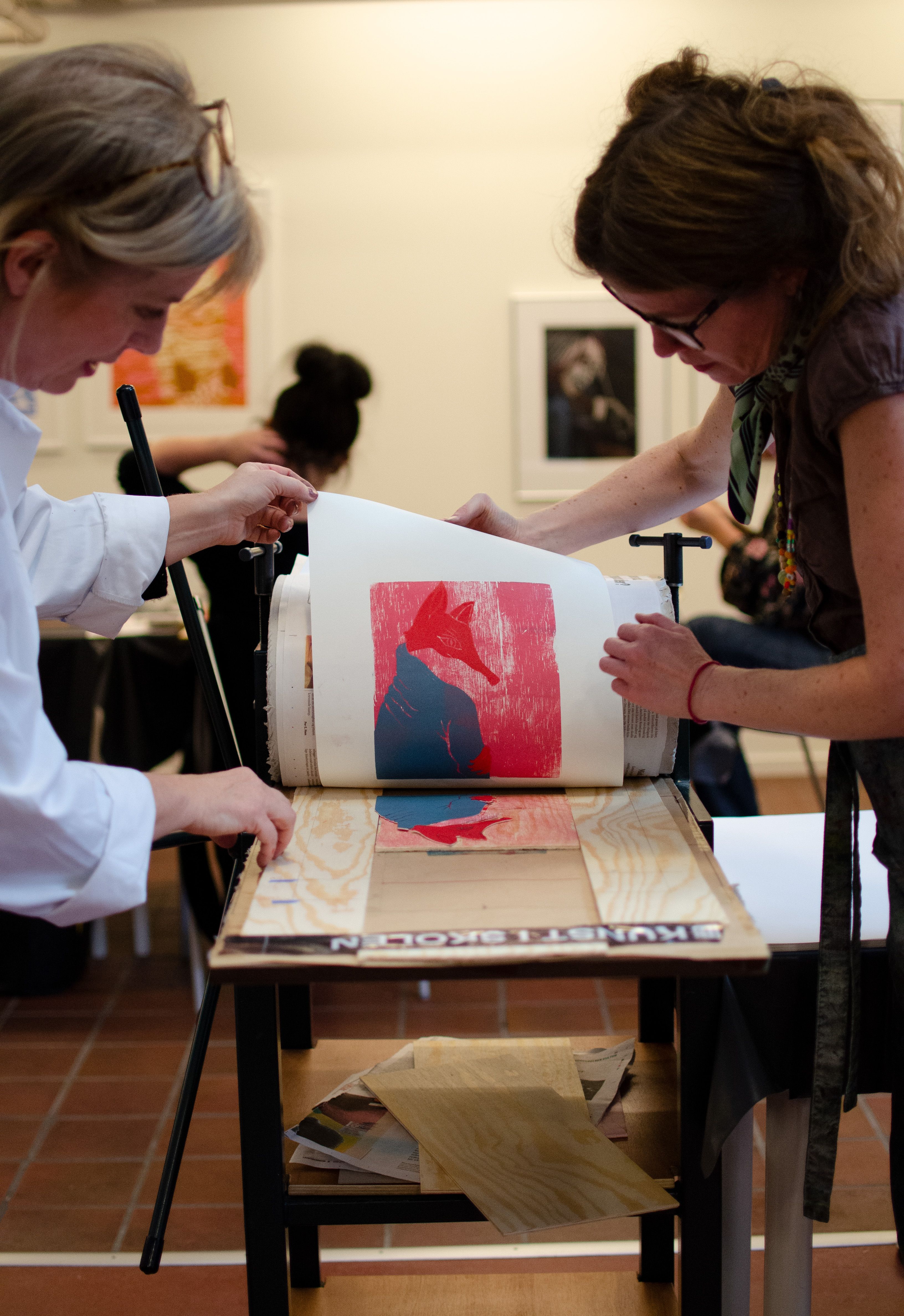 I arbeid med reduksjonstrykk kan det være en fordel å ha en skisse med farger. Deltagerne startet med å skjære ut feltene som skulle være hvite, og trykke opp hele opplaget i en lys farge. Deretter ble det skjært videre, slik at motivet ble redusert når det trykkes med den neste fargen. Når det er klart for neste farge trykkes denne oppå alle de første trykkene - og på denne måten kan man fortsette å redusere for hvert trykk og hver gang endre fargen.