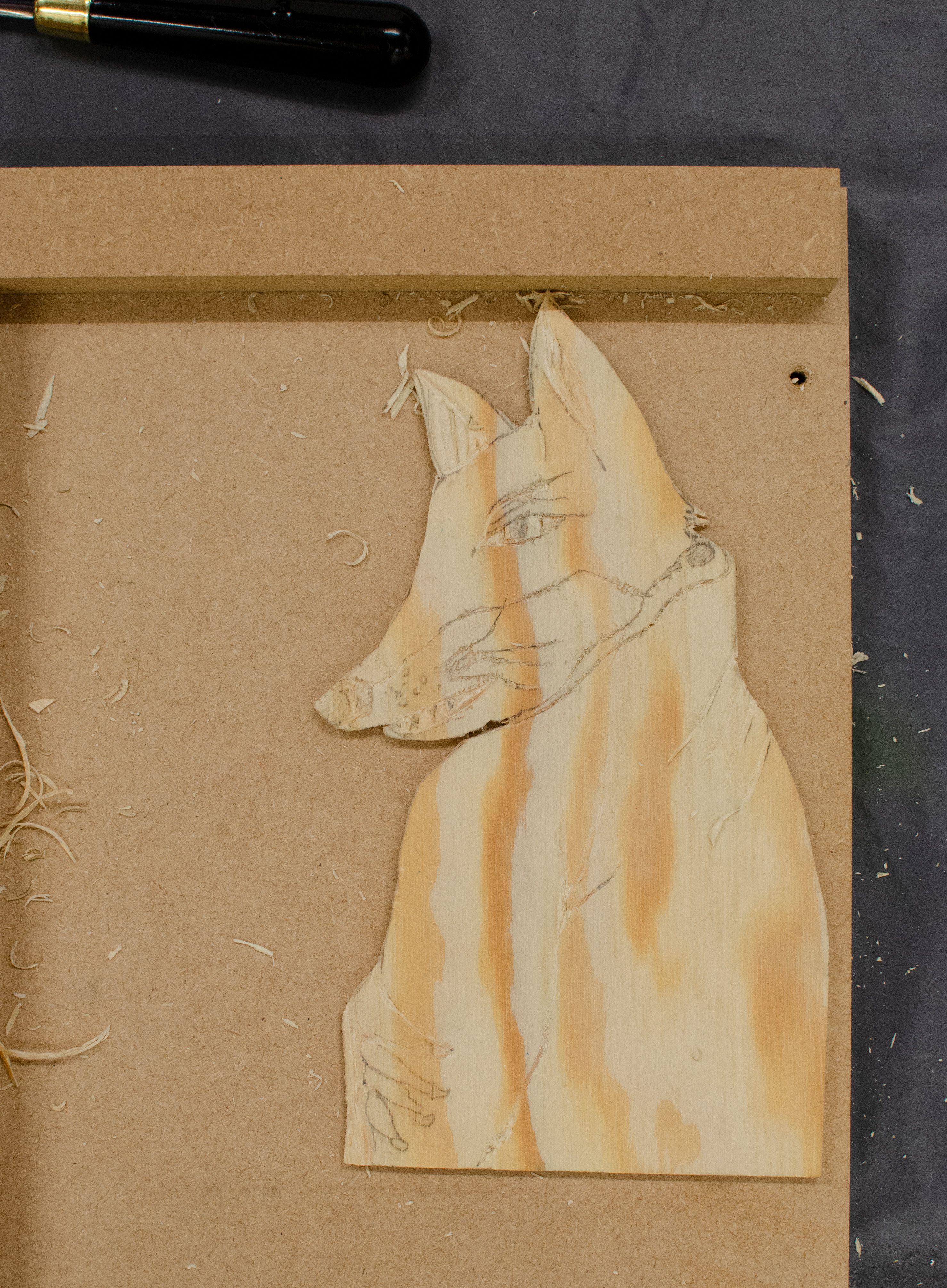 Fargen er valset på trykkplaten og ligger på platens høyeste punkter. Alt som skal være hvitt, skjæres bort med kniv eller huljern. Viktig å alltid skjære i fra seg og bruke et skjærebrett.